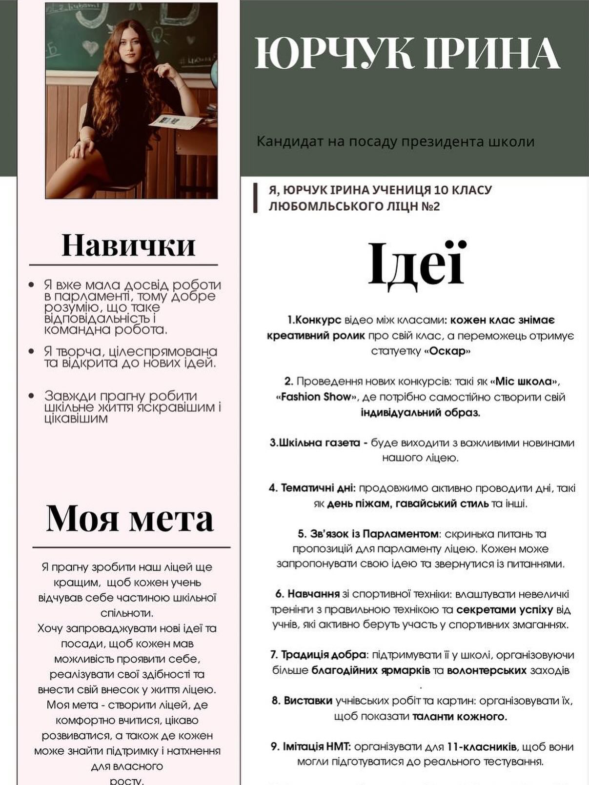 Президентом стала Юрчук Ірина. Вітаємо Іринку з перемогою та званням Президента Любомльського ліцею №2. Бажаємо натхнення, нових ідей та успішного лідерства на шляху до розвитку нашого ліцею. Тепер у нас новий лідер, нові ідеї та нова енергія!